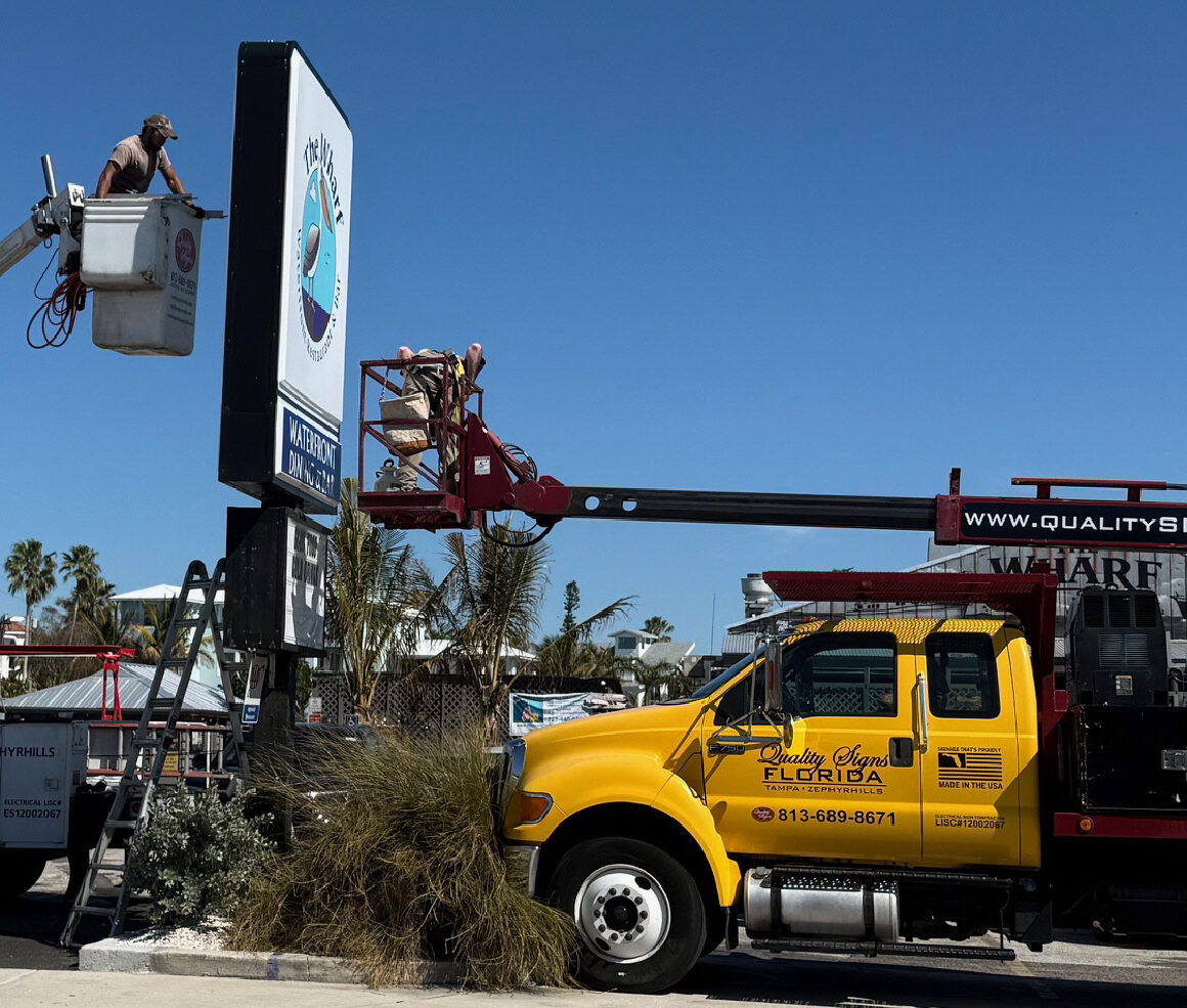 As a fully Florida-licensed electrical sign contractor, we handle every step safely and compliantly. Our in-house fleet — including a large Elliott sign crane truck and multiple bucket trucks — ensures precise, professional installs across Tampa, Wesley Chapel, Brandon, Riverview, Valrico, and surrounding counties (Hillsborough, Pasco, Polk, Manatee).
